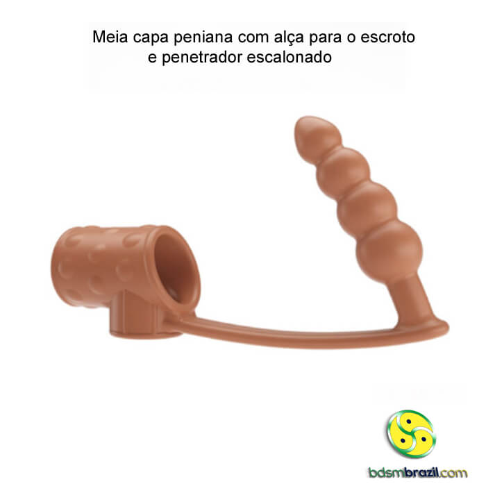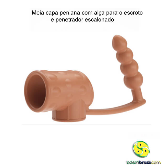 Meia capa peniana com alça para o escroto e penetrador escalonado.